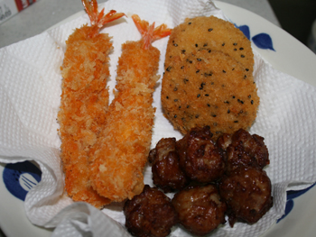 豚の唐揚げは自作ですが・・・ エビフライとコロッケは冷凍食品ですよ。 ええ。良いのですよ。カリカリの状態で食えるなら。