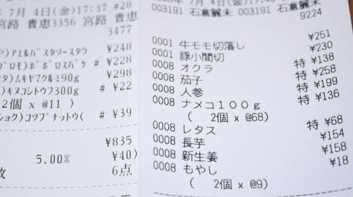 えーっと。毎週木曜日は実家に帰って社会人バドミントンなんで。 昨日は更新しませんでした。 実は体育館の工事で8月いっぱいバドミントンはないんですけどね。 という事で本日の夕飯。 もやし・ワカメ・キュウリの・・・サラダ? ぽん酢をかけて頂きます。 トロロ芋とオクラ。ネバネバ最高。 肉じゃが・・・もどき? 見えないけど。しめじ&納豆の味噌汁。 以上。 そうそう。いつも買い物に行く店の安さに感激なんですけどね。 見えるかな~? 豆腐11円。もやし9円。納豆39円。レタス68円。 今回は買ってないけど牛乳148円。卵98円。 毎日がこの値段。この店最高!!! だと思いませんか?激安でしょ??? もしも別の部署に移動になって、帰り道に寄れなくなったら・・・ 我が家の食費は確実に1.5倍ですがな。